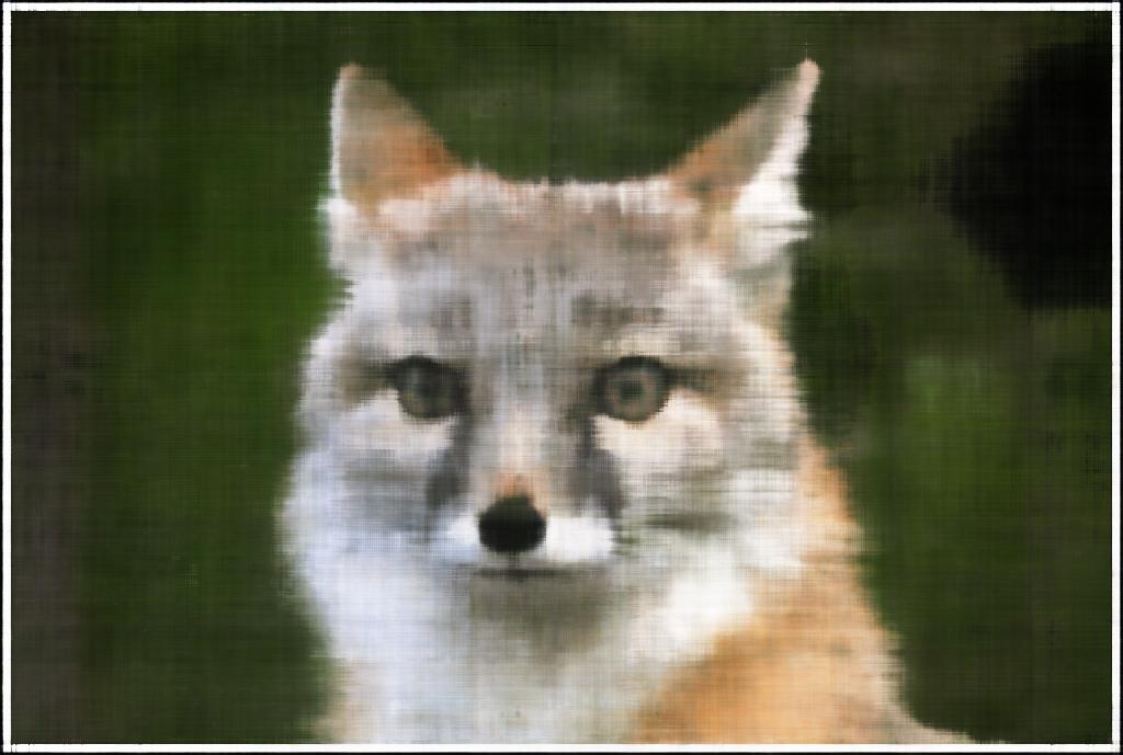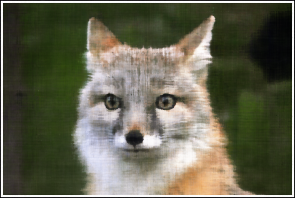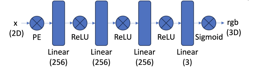 The network has four linear layers each with 256 channels. The output is a the dimensional with the channels R,G and B which constructs the image.