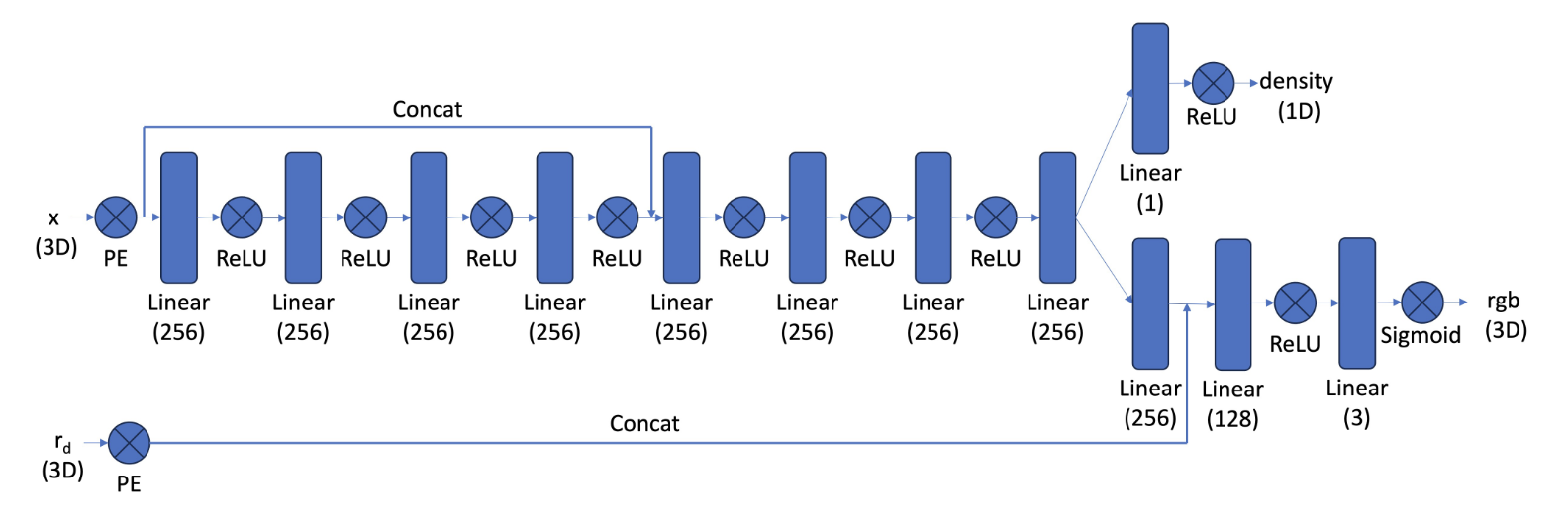 Having the samples in 3D, the neural radiance field (NeRF) was implemented in accordance with the architecture presented below.
